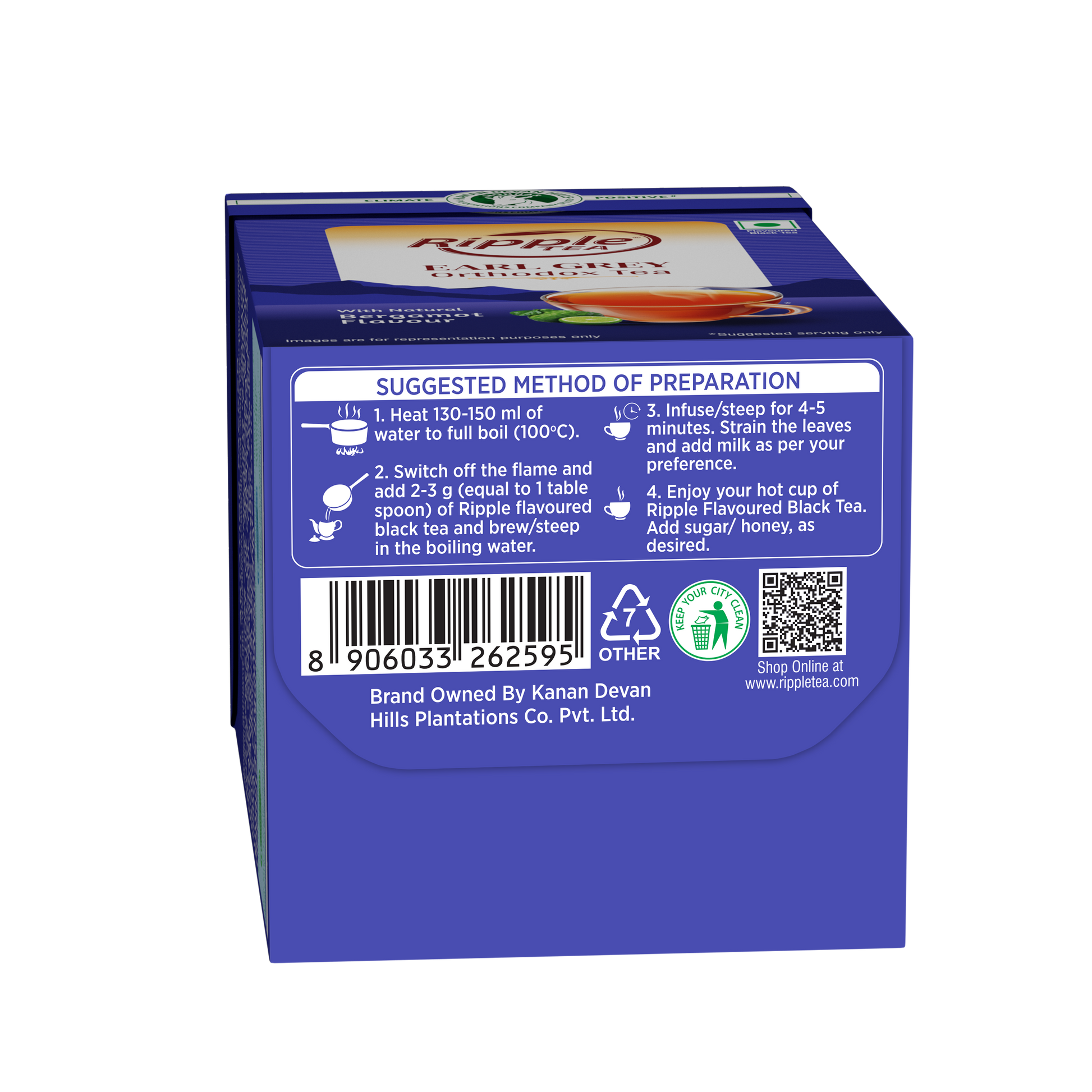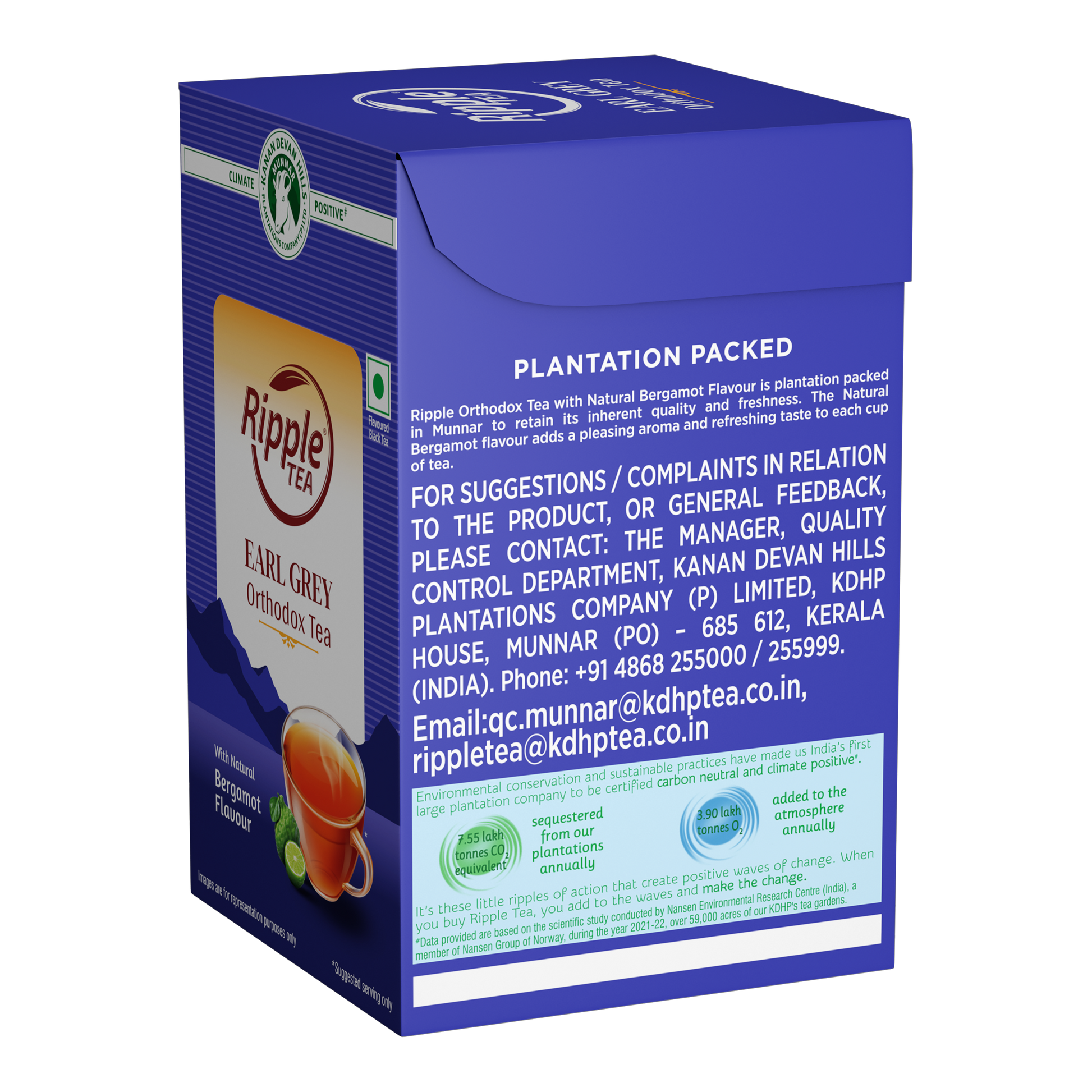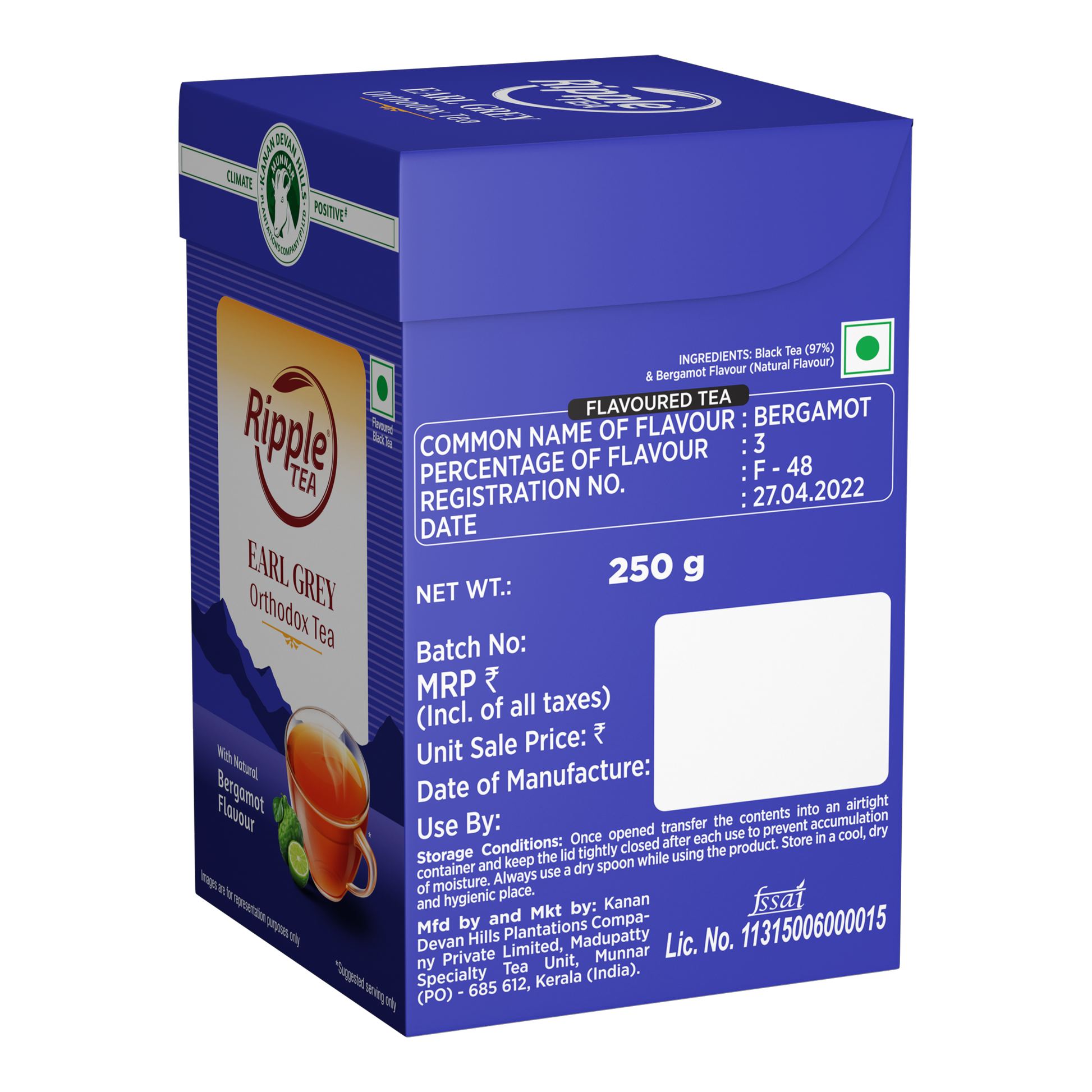 Ripple Orthodox Tea with Natural Bergamot Flavour is plantation packed in Munnar to retain its inherent quality and freshness. The Natural Bergamot flavour adds a pleasing aroma and refreshing taste to each cup of tea.