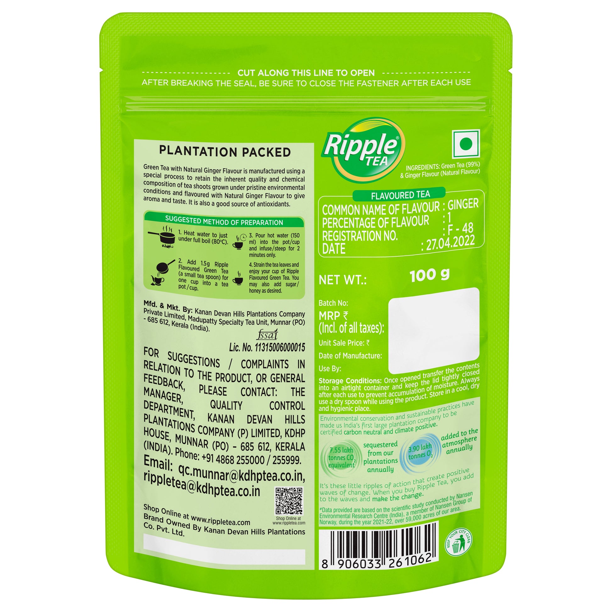 - Preparation : Heat Water to just under full boil (80 degree) Add 1.5 gm Ripple flavoured green tea ( a small tea spoon ) for one cup into a tea pot / cup Pour hot water (150 ml ) into the pot / cup and infuse / steep for 2 minutes only Strain the tea leaves and enjoy your cup of Ripple Flavoured Green Tea. You may also add sugar / honey as desired