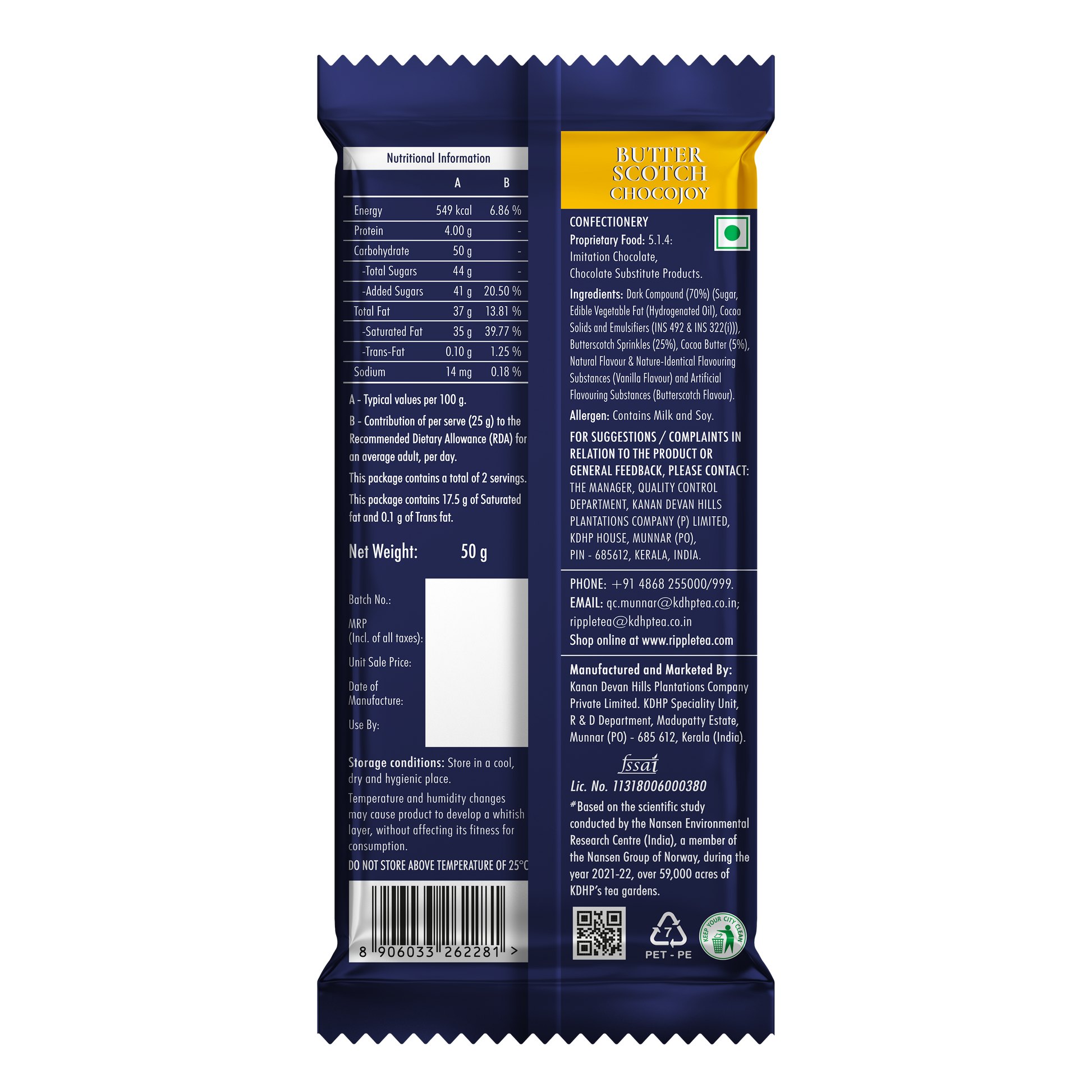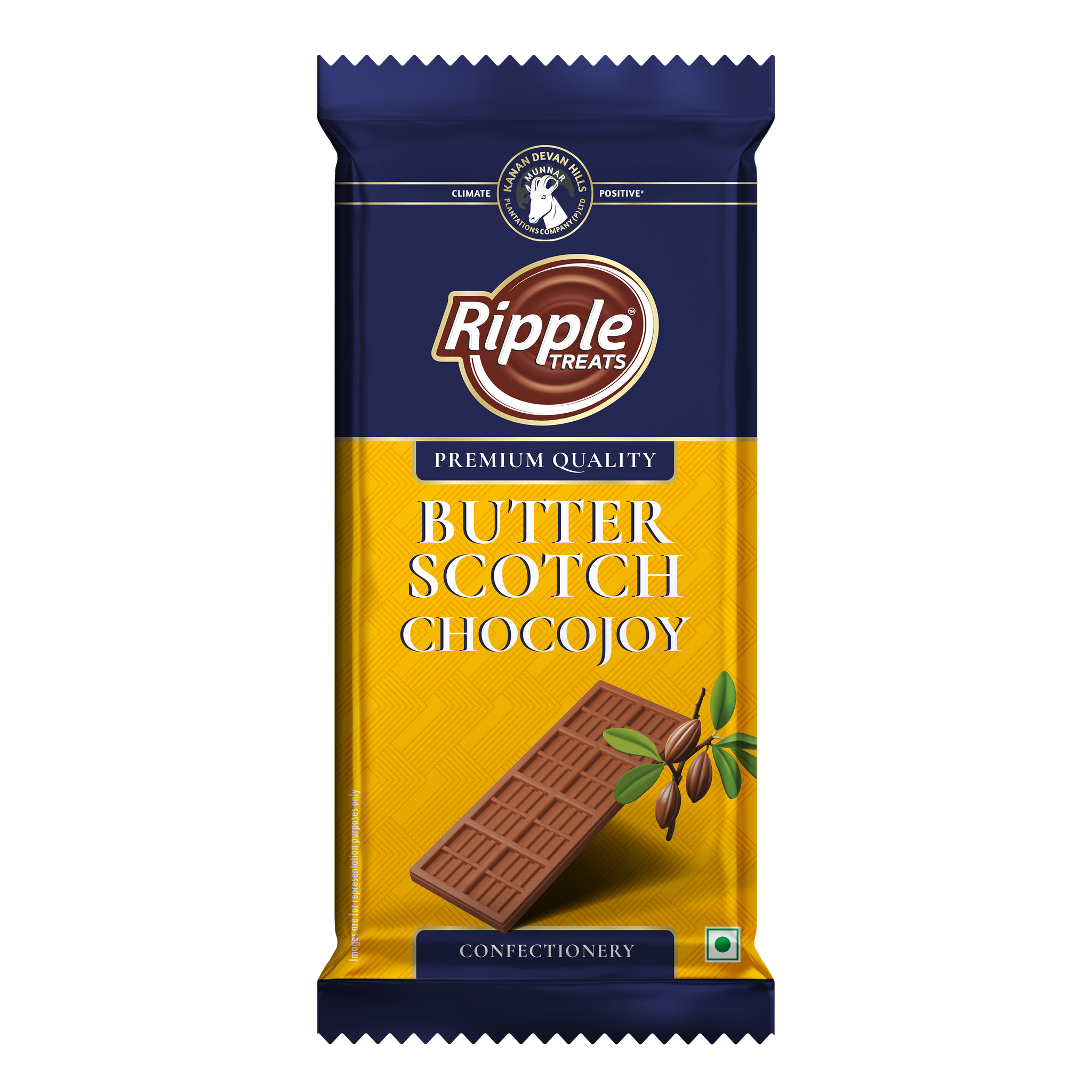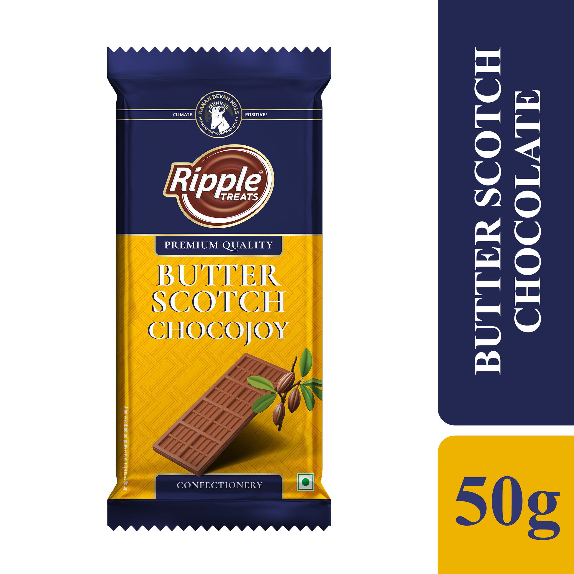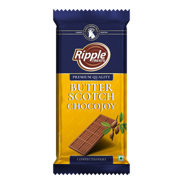 Ripple Treats Butterscotch Chocojoy is a delicious handmade confectionery. This superior quality product, contains good quality Dark compound, Cocoa solids, Butterscotch Sprinkles , Coco butter, sugar and flavouring substances at right combination to give you a sweet and joyful treat.