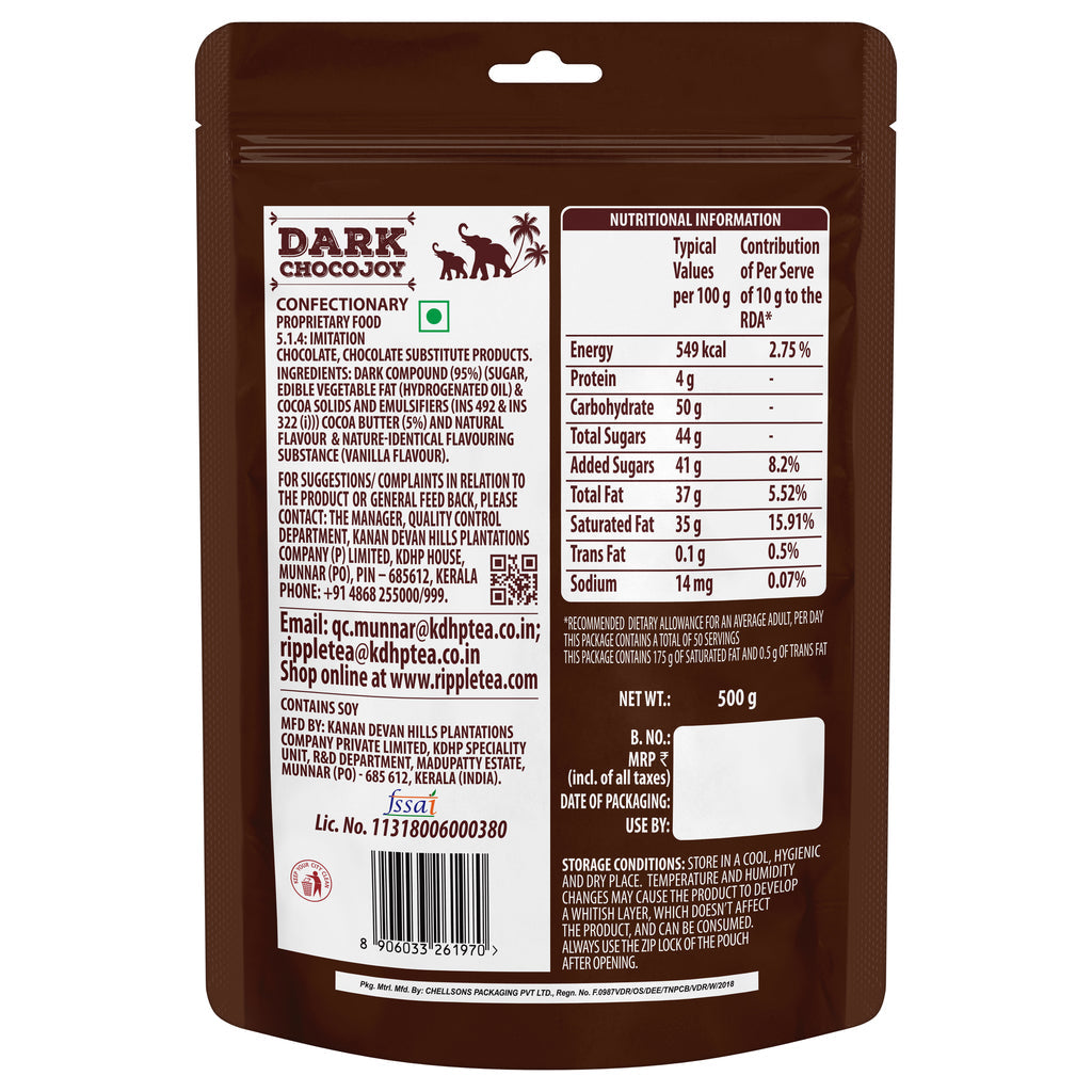 Ripple Treats Dark Chocojoy is a delicious handmade confectionery. This superior quality product, contains good quality Dark compound, Cocoa solids, Coco butter, sugar and flavouring substances at right combination to give you a sweet and joyful treat.