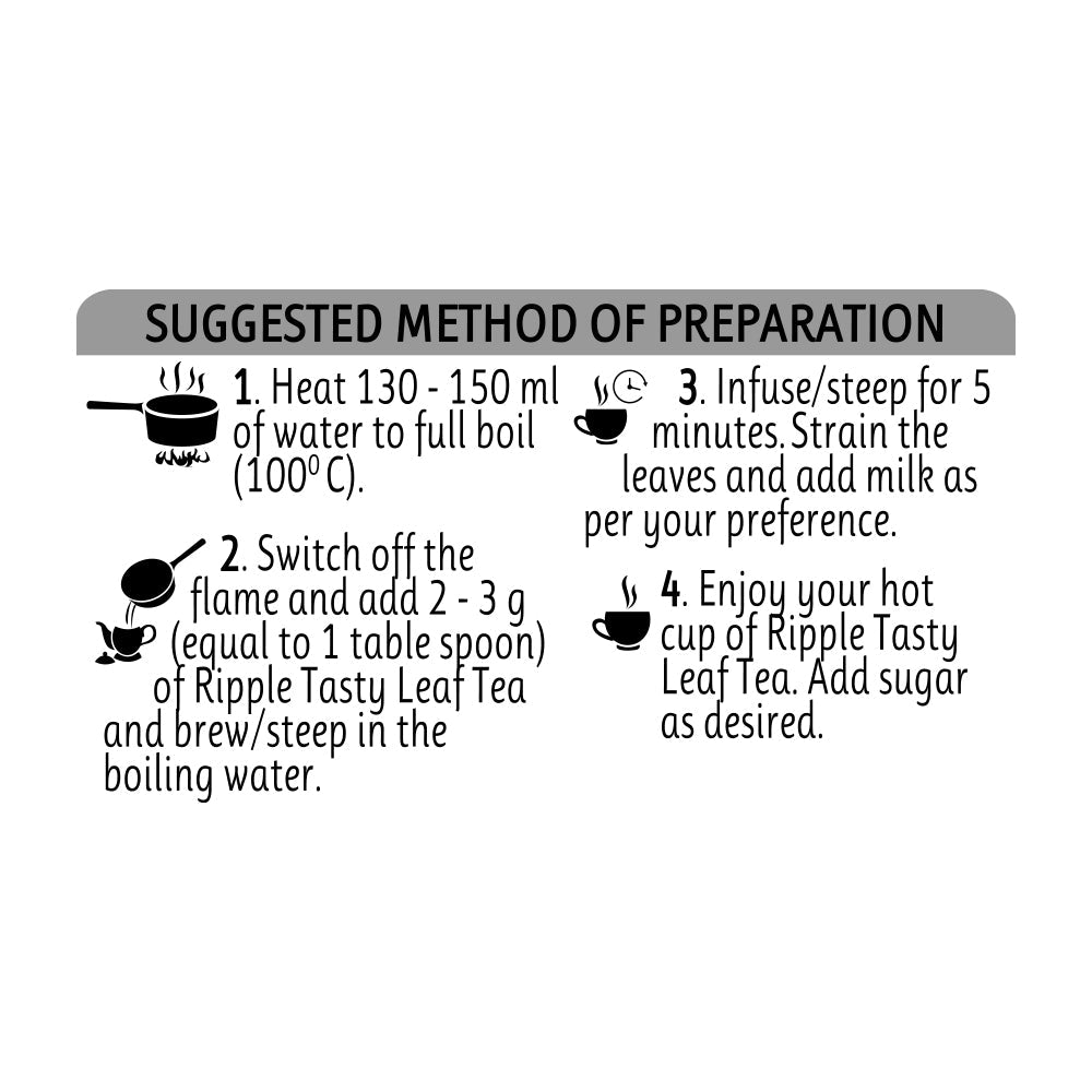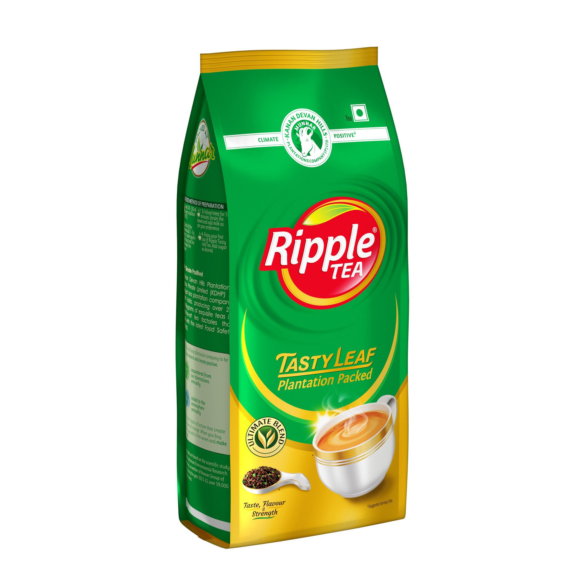 The ultimate blend of three unique teas. Ripple Tasty Leaf Tea strikes the perfect balance between the strength of a full bodied CTC Tea, the delicate taste of high grown Orthodox Long leaf tea and the flavour of Hard withered Teas.