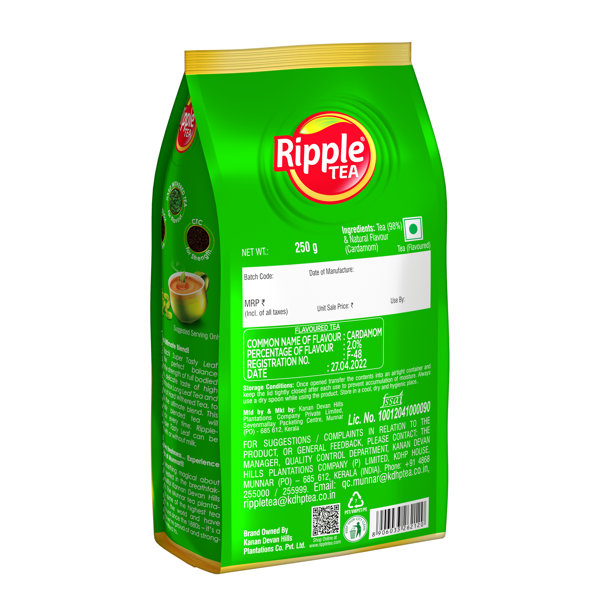 Ripple Elaichi Super tasty leaf strikes the perfect balance between the strength of a full bodied CTC Tea, the delicate taste of high grown Orthodox Long leaf tea and the flavour of hard withered Tea to bring you the ultimate blend . This meticulously blended tea will refresh you every time . Ripple Elaichi super tasty leaf tea can be enjoyed with or without milk .
